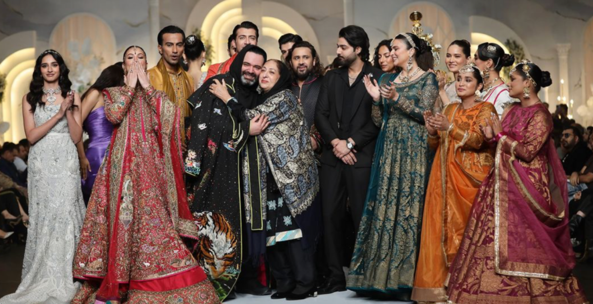 Featuring Mehwish Hayat as the showstopper for his solo, also added to his flair, as the actor complemented the bridal ensembles which were traditionally lavish but with a conscience of protecting technique and craft. The deep tone of red worn by the star – which Fahad has perfected over his time in the industry worked as the perfect finale to the show, as him, his showstopper(s) and the most important person of them all, his mother, walked down to showcase the brand’s gratitude at the BCW stage.