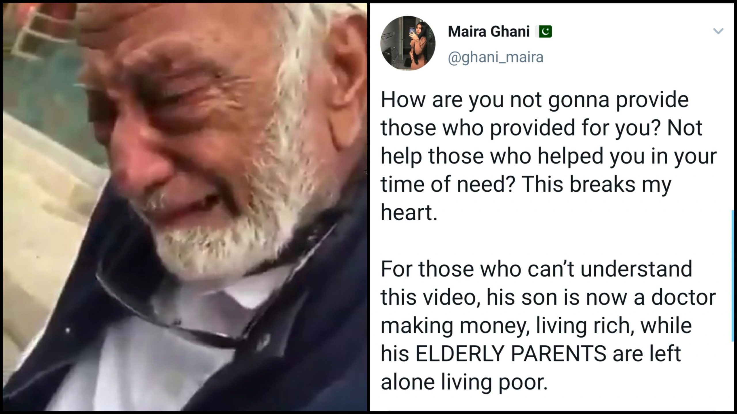 The old man is saying how he has a son, who’s a doctor and earns a lot and is very well off,yet he himself is on the streets begging for money as his son has refused to take him in.May Allah’s curses be upon those who abandon the ones who raised them when they couldn’t even walk. https://t.co/8FzXfy5xpN