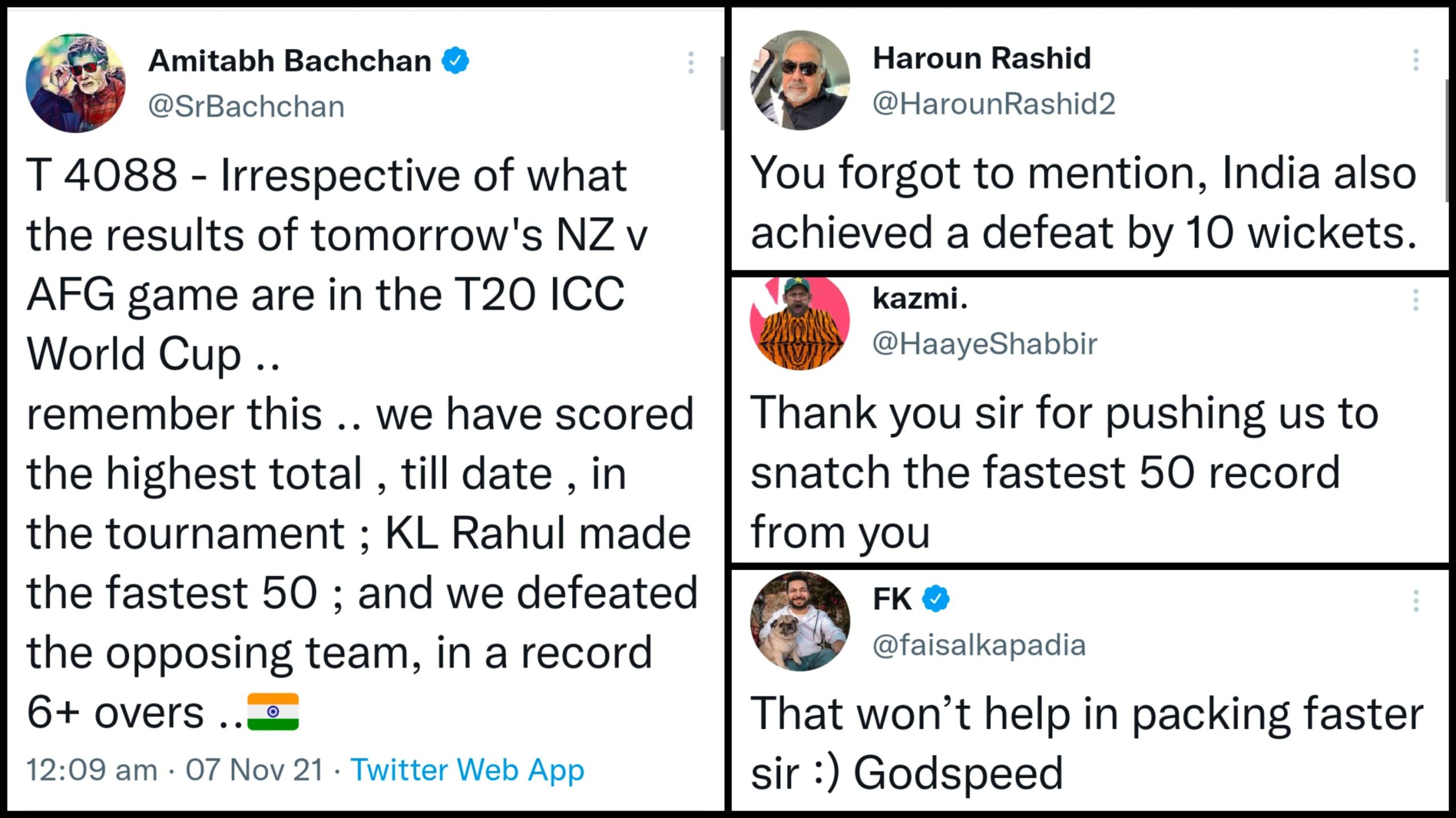remember this .. we have scored the highest total , till date , in the tournament ; KL Rahul made the fastest 50 ; and we defeated the opposing team, in a record 6+ overs ..🇮🇳— Amitabh Bachchan (@SrBachchan) November 6, 2021