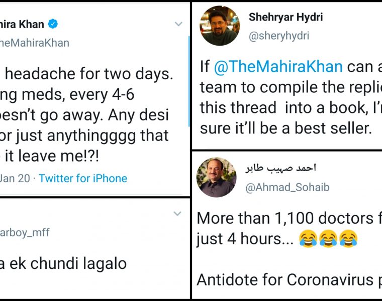 The country’s sweet heart, Mahira Khan, turned to twitter hoping to get a few tried and tested desi nuskhas for an ongoing headache: I’ve had a headache for two days. Been taking…