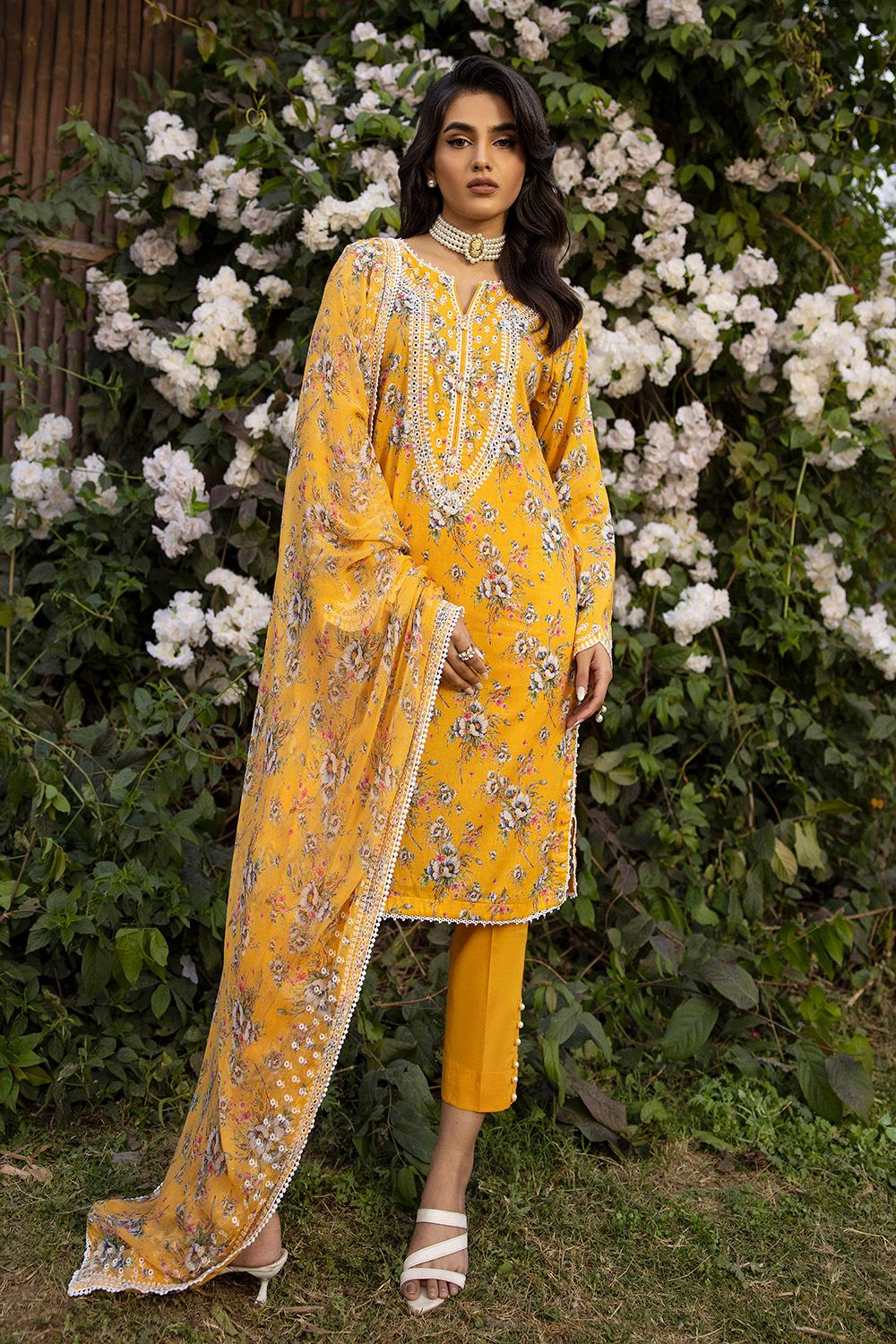 2. Embroidered Printed Lawn Unstitched Suit (BCT-42008): Embrace the beauty of summer with this vibrant embroidered printed lawn suit. The delicate embroidery and printed chiffon dupatta create a fresh and feminine look that’s perfect for daytime events and casual outings.