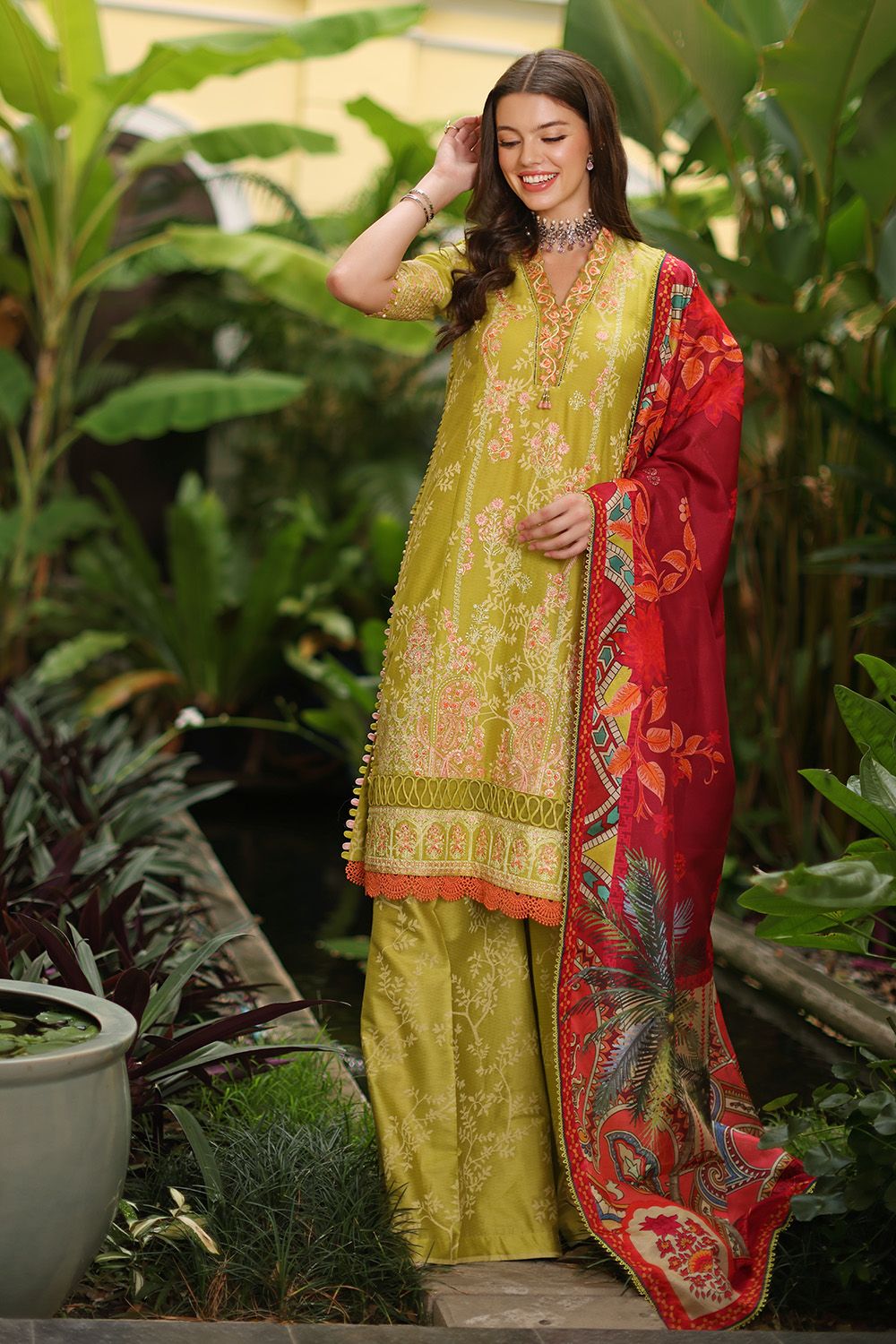 3. Embroidered Paper Cotton Unstitched Suit (LE-42016): Elevate your summer style with this refreshing lemon-shade embroidered paper cotton suit. The intricate embroidery and matching dupatta add a touch of sophistication, making it a versatile choice for both day and night.