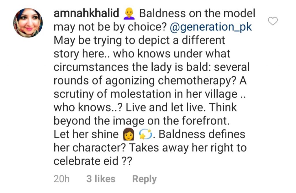 Beautiful, right? But majority of the people don’t think so. The comment section was full of vile and disgusting remarks for the model. Despite the fact that the model represents those who might have lost their hair due to chemotherapy, skin conditions or just want to rock the haircut, people had serious problems digesting the campaign: