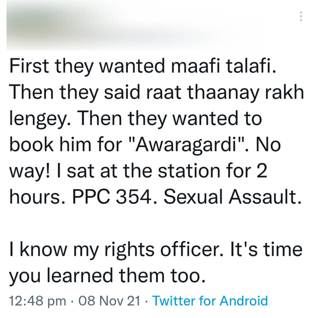 PPC Section 354. Sexual Assault. One year imprisonment. I know my rights officer. #StrongWoman https://t.co/FmoMfEgpl2