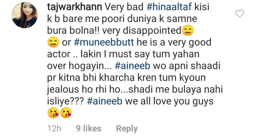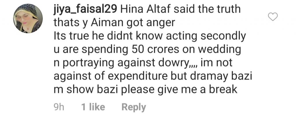 And to remind him, Hina mentioned the hashtag #AineebKiShadi. After which the host threw shade at Aiman too for posting a photo with the ‘jaheiz khori band karo’ sticker a day after her extravagant wedding.