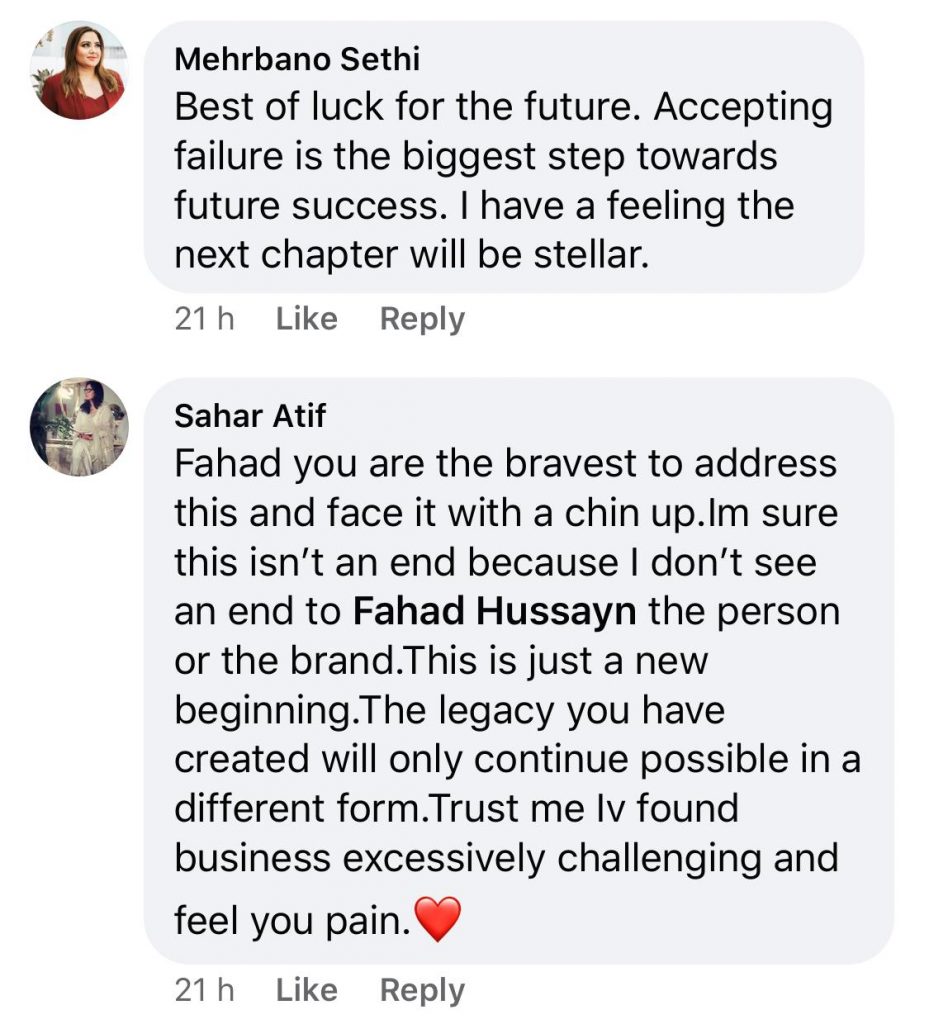 “Fahad Hussayn as a brand is proud and very grateful for the amazing journey through the years creating iconic looks,” Fahad wrote. “In turnout to events that did not work in our favour, the brand has undergone bankruptcy and with a heavy heart, We are stepping down from business and bid you all adieu for this chapter in our story.”