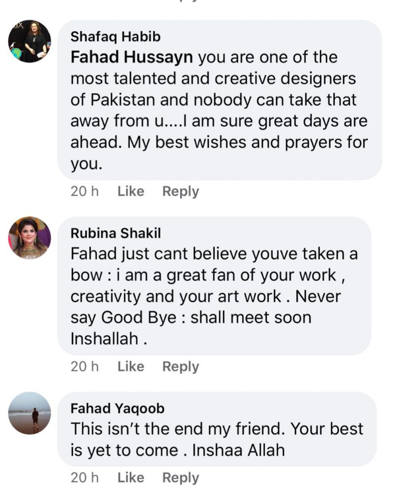 The fashion industry within Pakistan has seen its fair share of successes and failures, but it has remained quite divided over the wins and losses. However, when Lahore-based fashion designer, Fahad Hussayn announced his exit from the industry due to financial troubles on Friday evening, a plethora of support and unity poured in.
