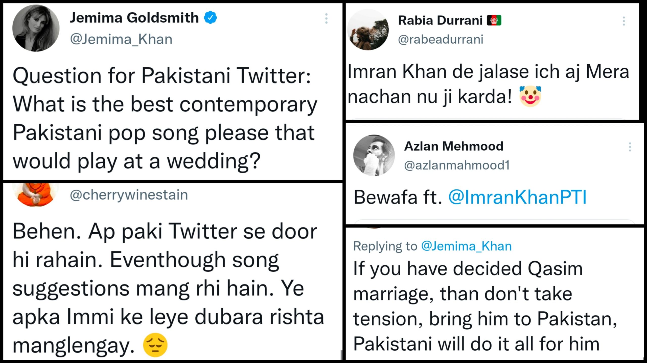 And as much as they love Jemima Khan, even she couldn’t get straight answers when she asked Pakistani tweeple to recommend her some good pop songs for a wedding:
