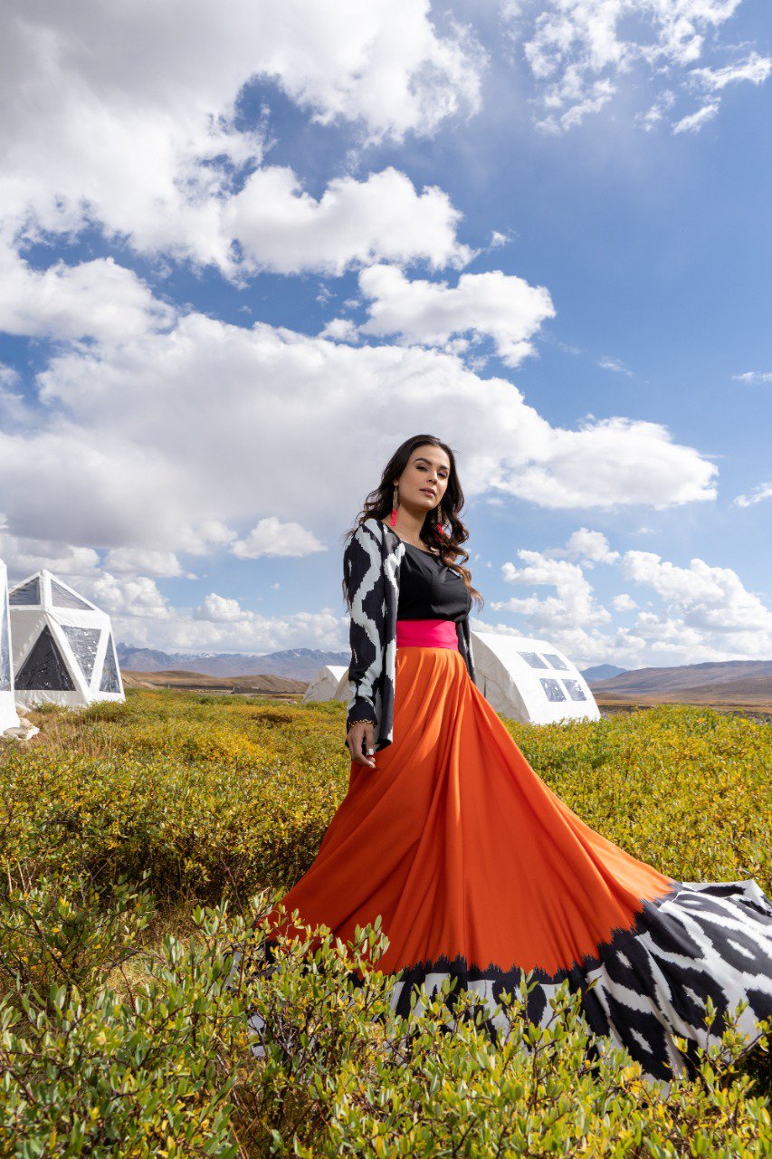 The craftsmanship of the collection endeavors to master the technique of ikat. In practice, the design of alternating stripes of red, white, yellow, and green with the dark brown brocade weaving pattern on ensembles that silhouette in sophistication and elegance. Ethnic fused with modern progressive wear in bright popping colors of Deosai that bring everything to life around them. Ikat hails from the culture of South Asia but now storms beyond central Asia to all over the world. Acclaimed international designers have studied and worked on a technique as complex as ikat.