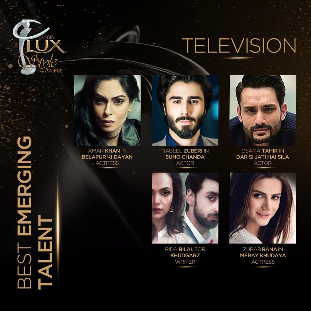 This category honours those budding stars who not only did justice to their roles but also put forward skills that can be honed further. There’s Amar Khan, whose role in Ghuggi was truly applause-worthy, Nabeel Zuberi, who forayed into television from modelling and won hearts in Suno Chanda, Osama Tahir, who isn’t relatively new, but has now gained prominence after Dar Si Jati Hai Sila, Rida Bilal whose writing made Khudgarz worth watching, and Zubab Rana whose role as Alina proved her excellence in acting.