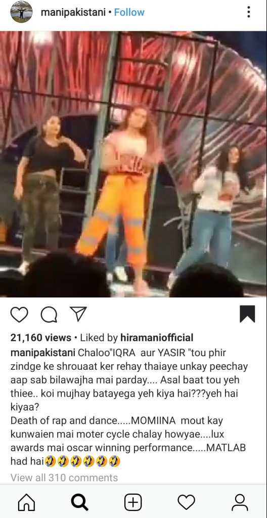 Another day and yet another LSA controversy. As the hype around Iqra and Yasir’s proposal dies down, Momina Mustehsan has been on the receiving end of criticism from fans and Mani for her performance at the Lux Style Awards. Mani shared a snippet of Momina’s performance with a long and confusing caption: