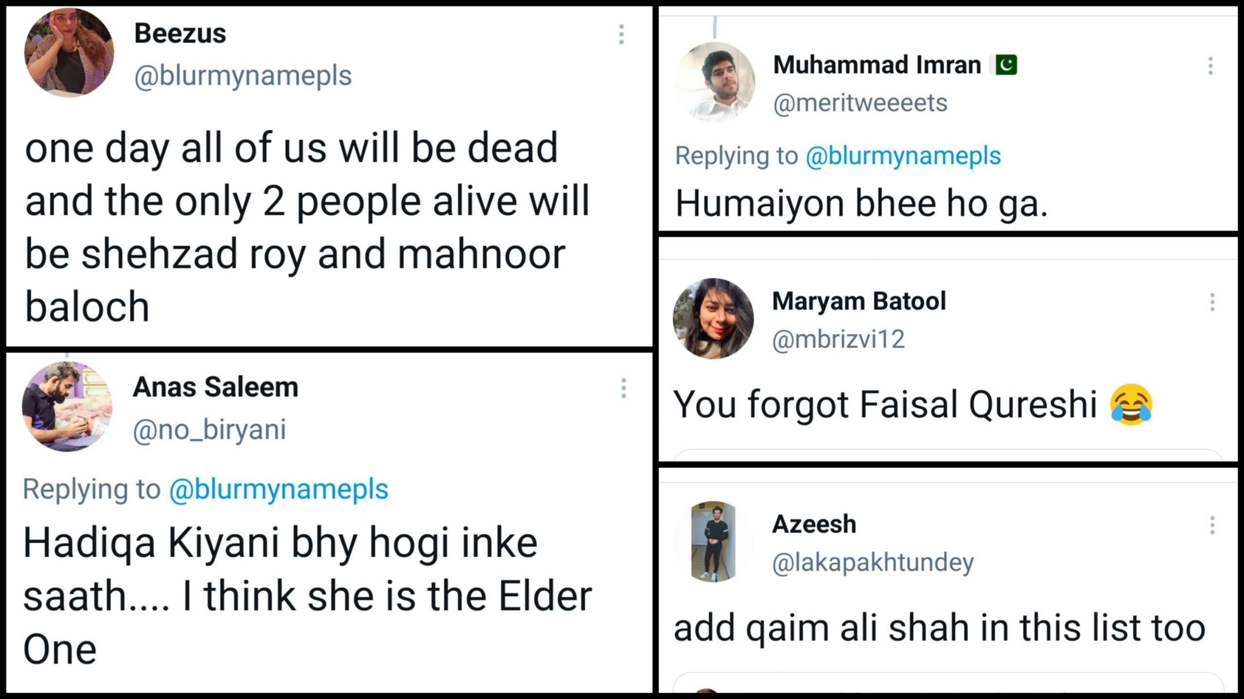 one day all of us will be dead and the only 2 people alive will be shehzad roy and mahnoor baloch