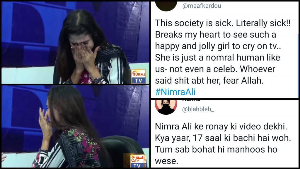This society is sick. Literally sick!! Breaks my heart to see such a happy and jolly girl to cry on tv.. She is just a nomral human like us- not even a celeb. Whoever said shit abt her, fear Allah. #NimraAli