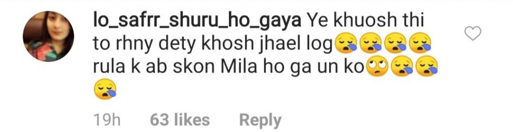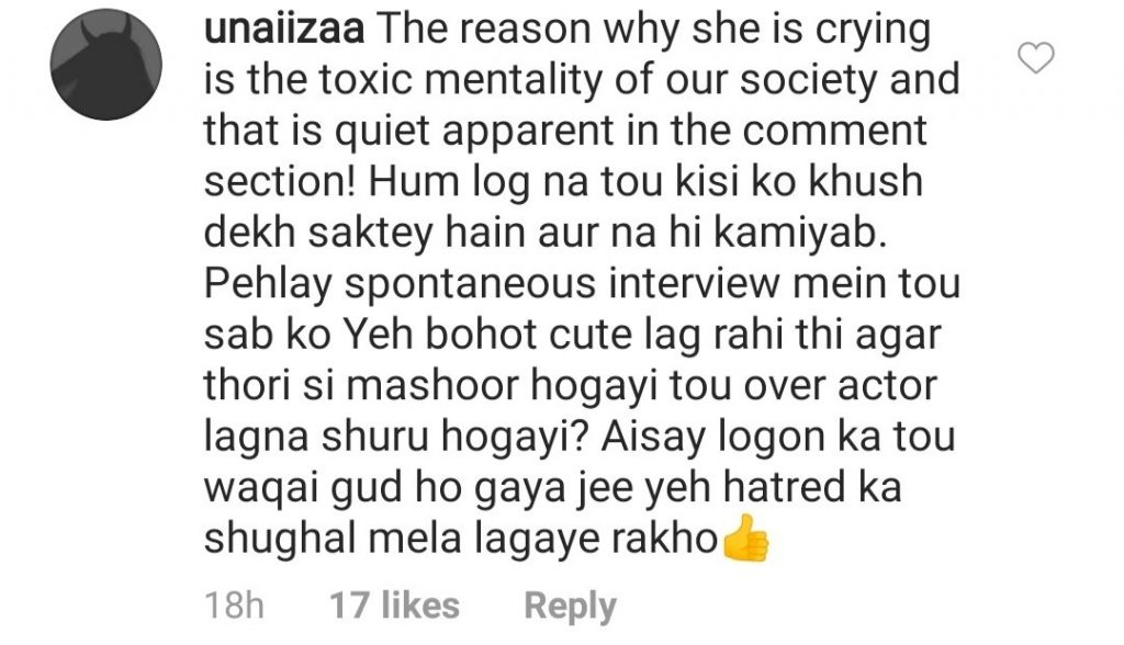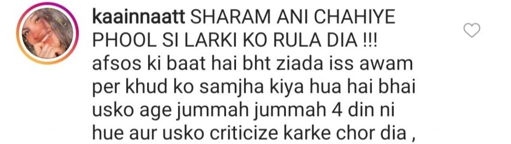 Nimra Ali ke ronay ki video dekhi. Kya yaar, 17 saal ki bachi hai woh. Tum sab bohat hi manhoos ho wese.