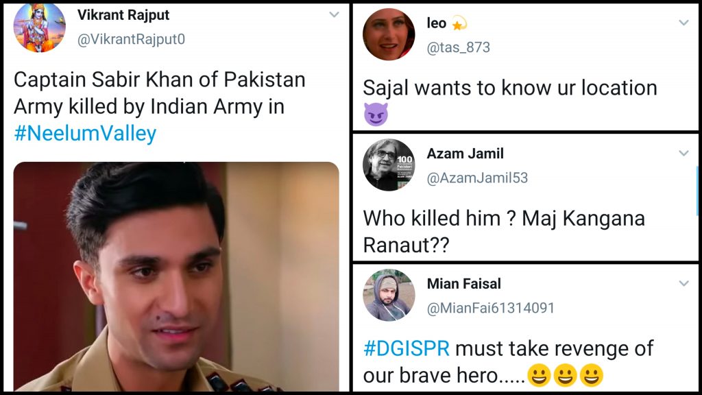 Dear @ahadrazamir Andhbhakts have apparently killed you on Twitter, Please tweet to let us/everyone know that you're fine and that your name is 'AHAD MIR' and not 'SABIR KHAN' and also that you're an Actor and not a Captain in Pakistan army! 😂😂😂 #NeelamValley #IndiaHammersPak https://t.co/ZF6PFUyLO1