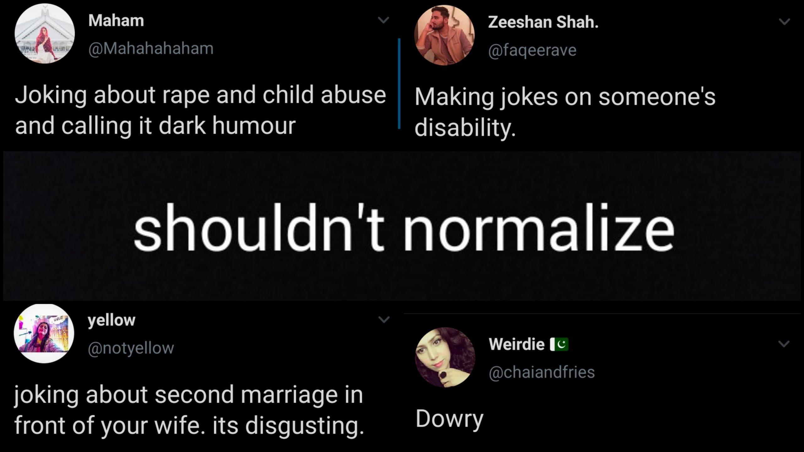 Jokes based on someone's insecurities. Color of skin, height etc. https://t.co/vvp5GqPFLC