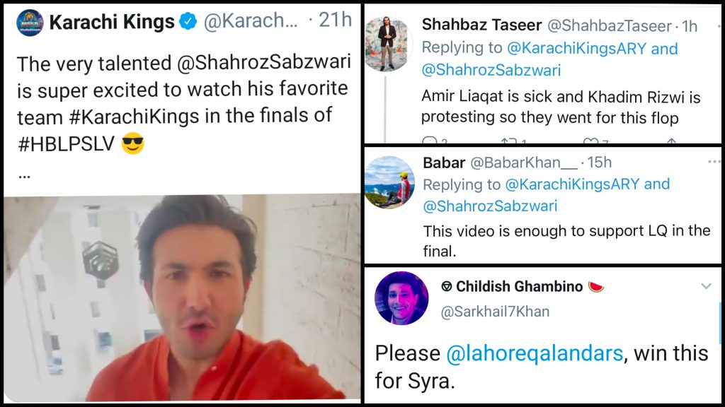 Among the promotions, the official PSL accounts for finalists Lahore and Karachi were sharing videos of celebrities supporting the teams, and one video in particular featuring Shahroz Sabzwari has fans rethinking their decision!