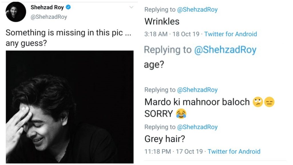 There are 2 people in the industry who do not age, Mahnoor Baloch and Shehzad Roy. Now we don’t know how exactly, but they just don’t seem to age at all. Sharing a picture to Twitter, Shehzad Roy asked his followers what was missing in the picture: