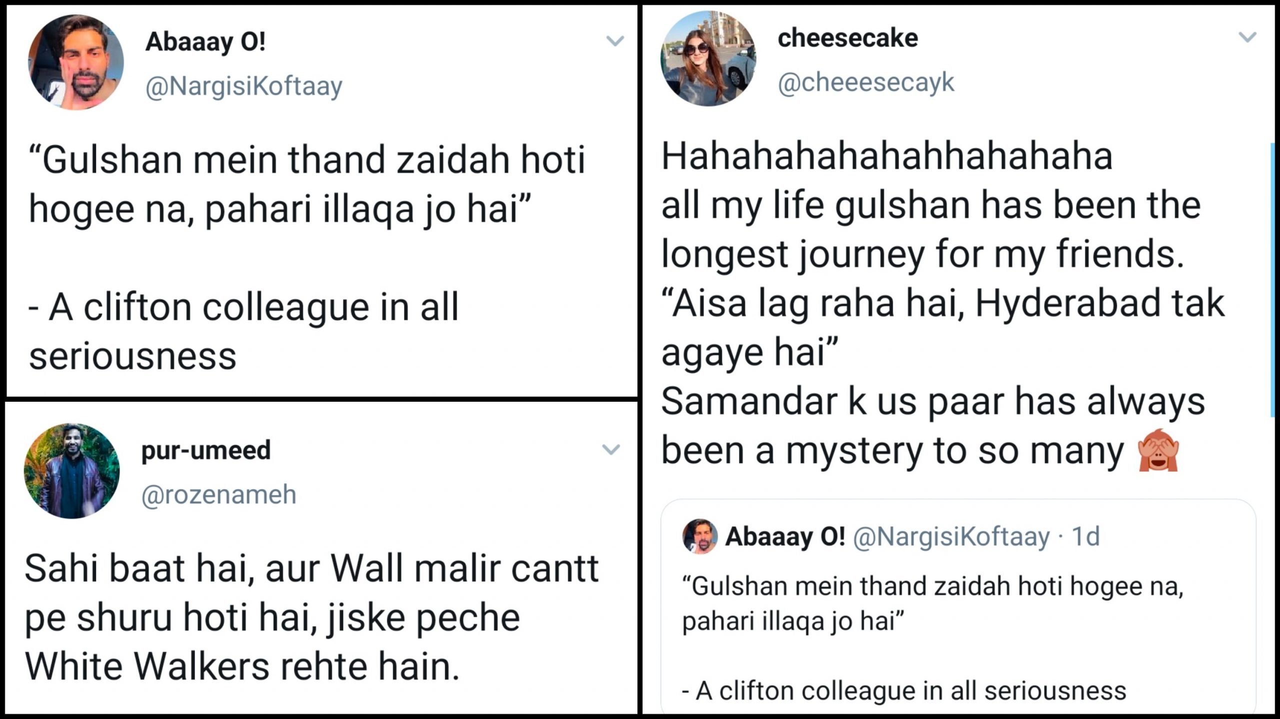 If you’re a Karachiite, you’d know the discrimination between pull ke iss paar and pull ke uss paar. This guy’s colleague legit had no idea what Gulshan was like and had theories of his own as to why Gulshan’s colder than areas that fall on the other side of the bridge: