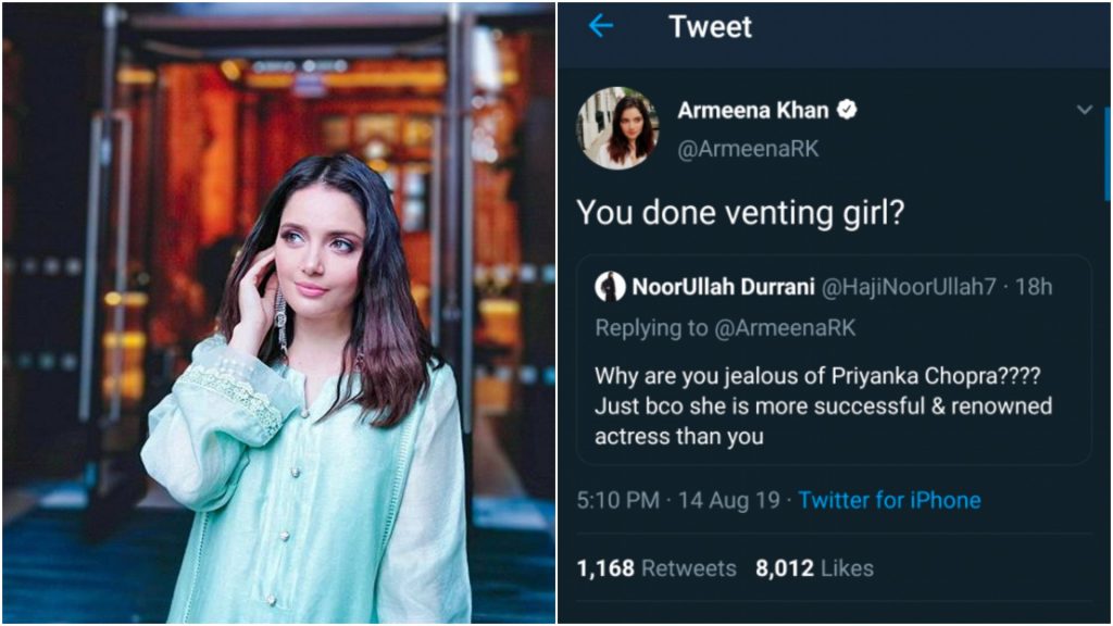But Armeena being her savage self, replied her with Priyanka’s very words: