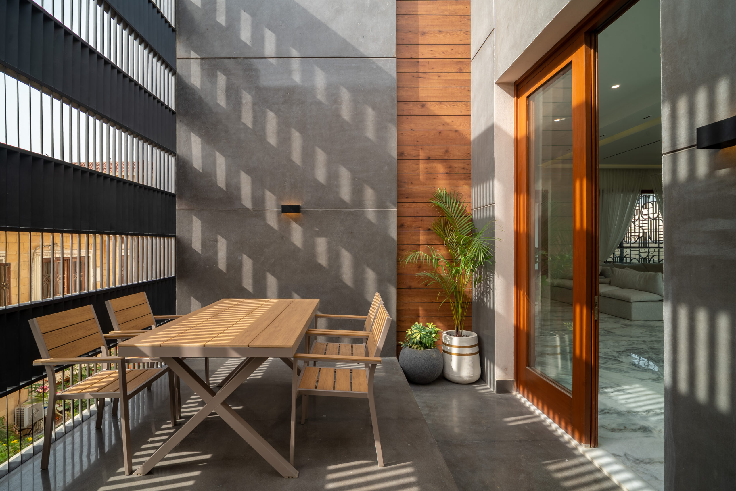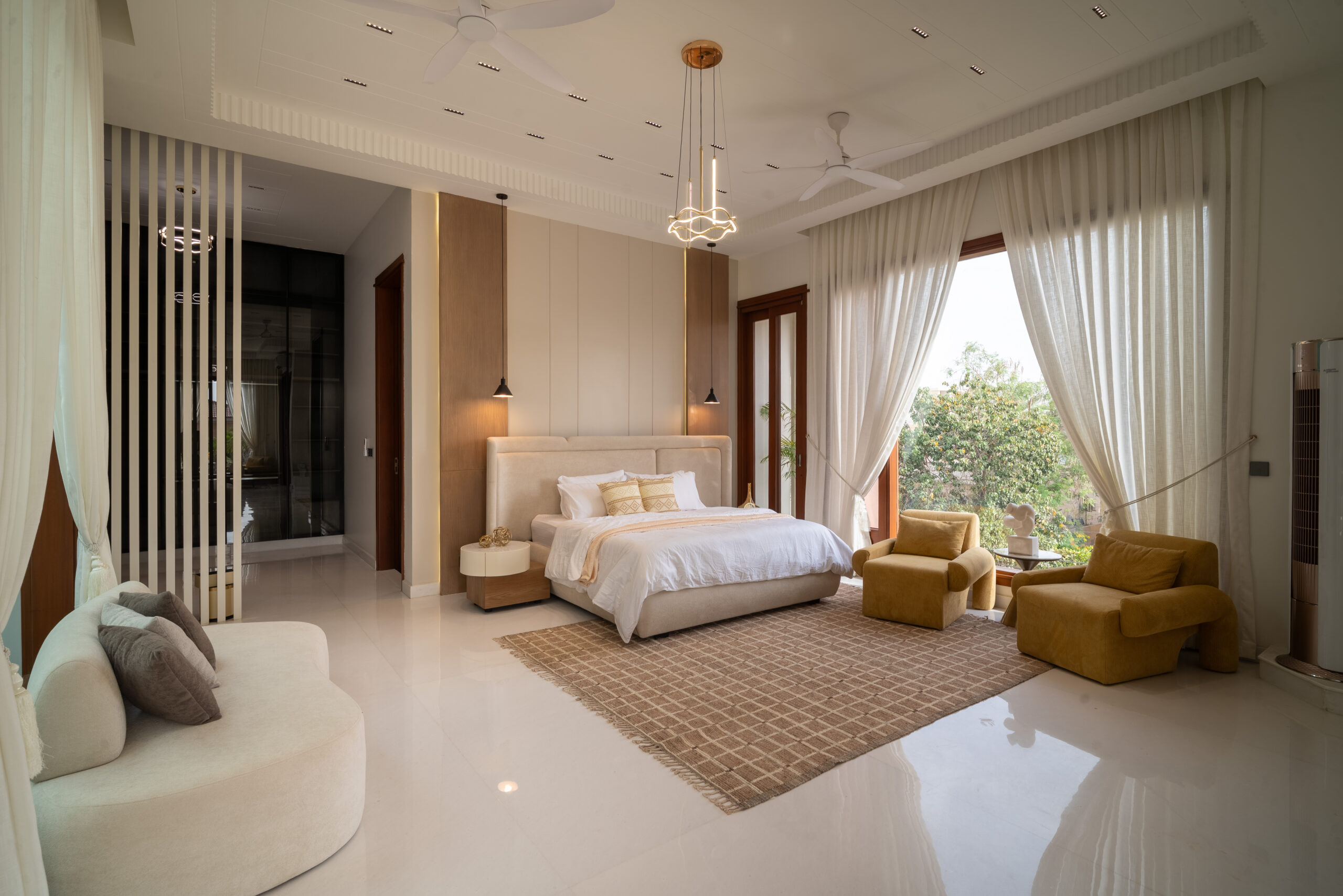 The master bedroom reflects a sleek and contemporary design language. Wooden textures and deco detailing give the room a modern identity, while the outdoor seating area adds a relaxing touch.