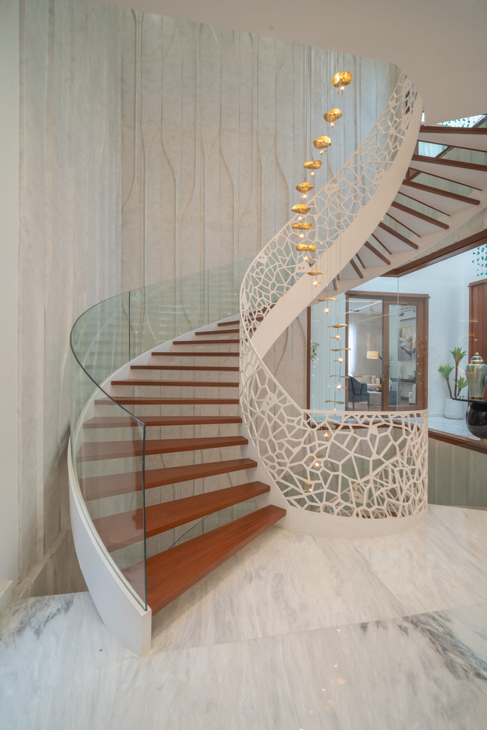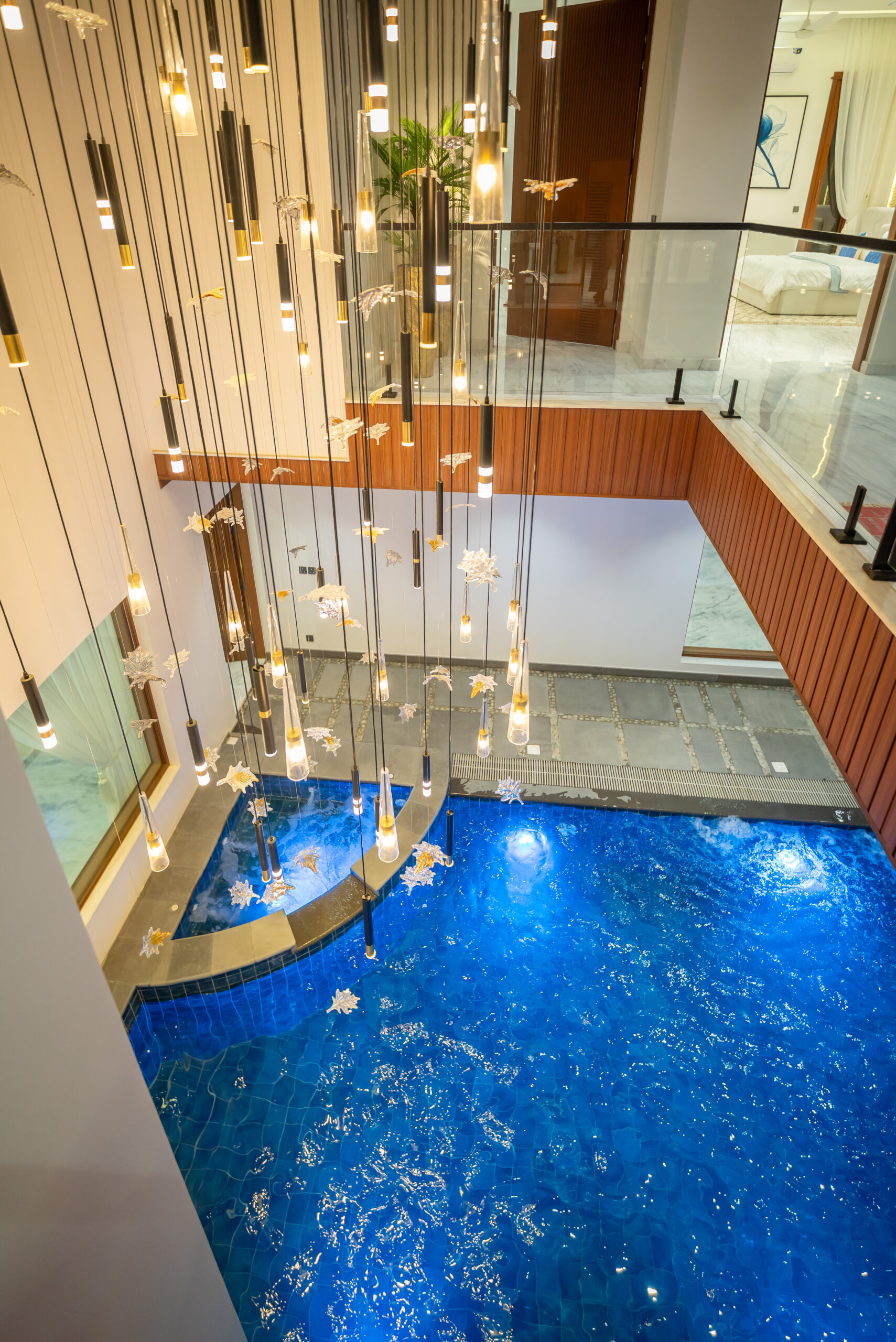 The first floor introduces additional spaces that combine design and relaxation. A beautifully designed staircase wall, complemented by a chandelier above, creates a dramatic transition between levels.