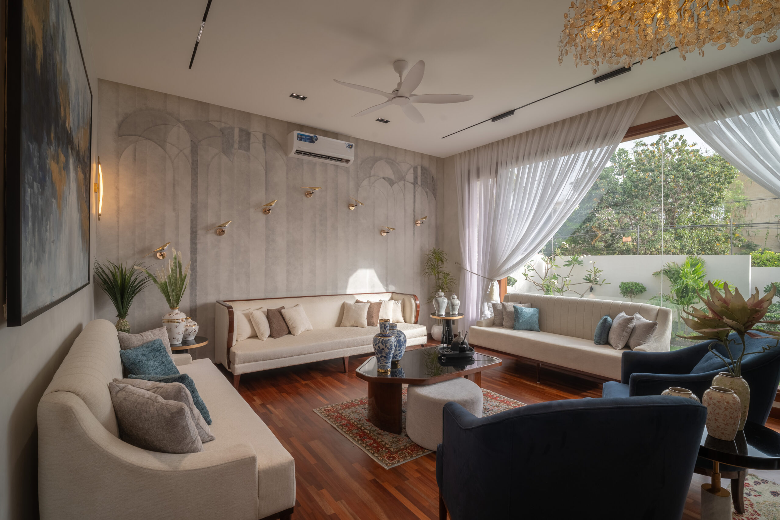 Inside, the drawing room stands out as one of the most striking spaces in the house. A hand-crafted artistic mural wall serves as the focal point, complemented by large windows that allow natural light to brighten the entire space.