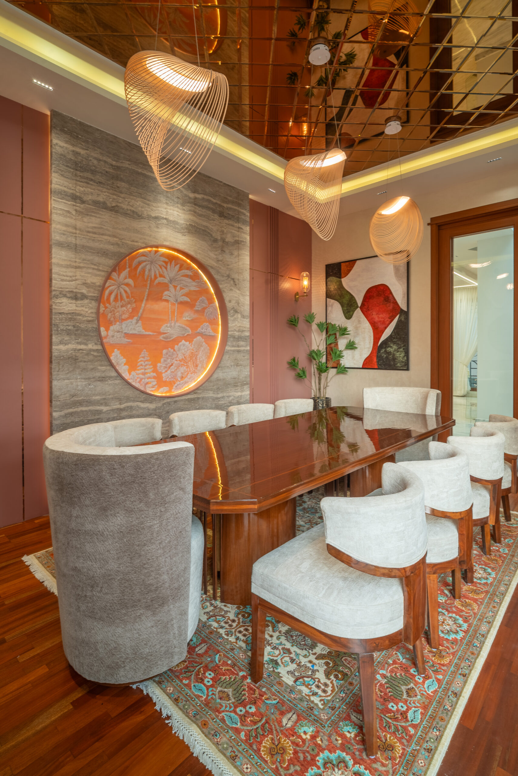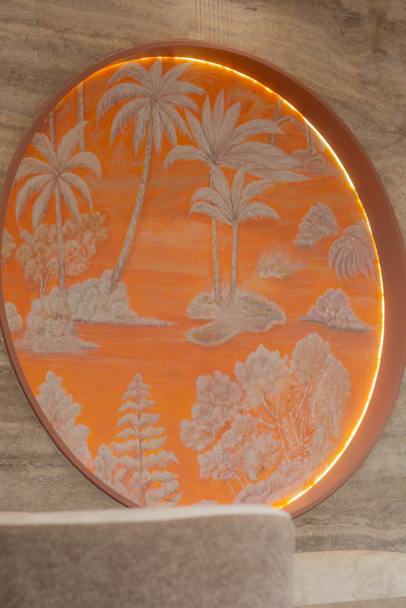 Moving into the dining area, another mural feature enhances the artistic identity of the home. Paired with elegant lighting and travertine wall detailing, the space feels both sophisticated and inviting.