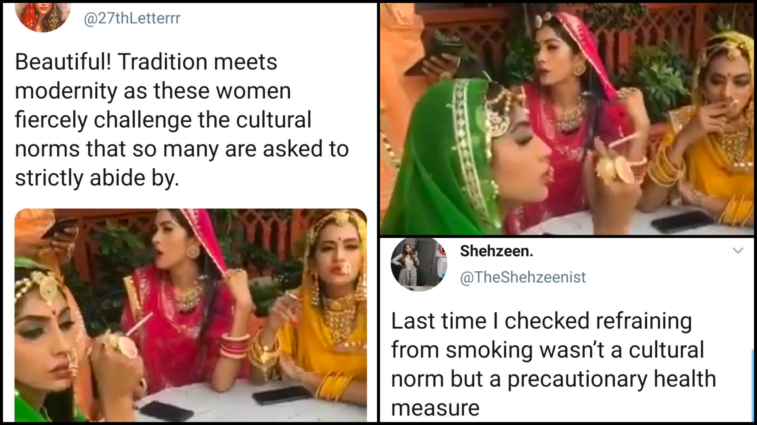 Everyday the twitterati finds something new to debate about, and today they’re debating if smoking makes you modern. A girl on Twitter shared a video that she finds beautiful, where young women dressed in traditional attire can be seen smoking cigarettes: