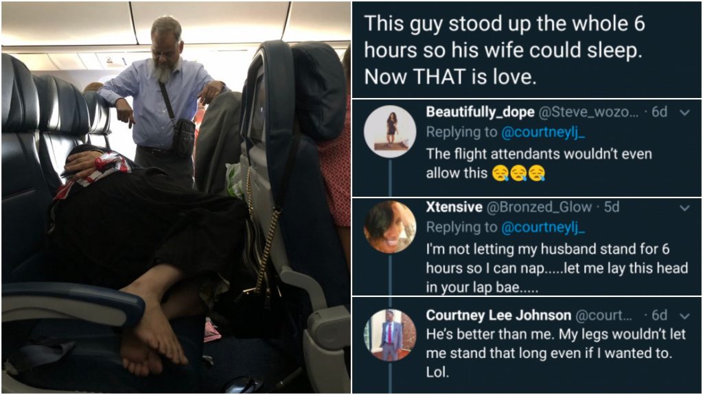 Another day, another disagreement at twitter! A man posted a picture of a man who kept standing throughout the 6 hour flight only to let his wife sleep peacefully on the plane.