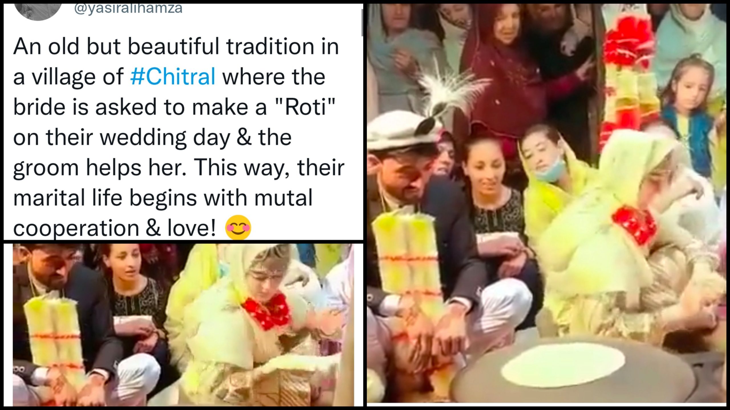 An old but beautiful tradition in a village of #Chitral where the bride is asked to make a "Roti" on their wedding day & the groom helps her. This way, their marital life begins with mutal cooperation & love! 😊 pic.twitter.com/vodtxNlXVq