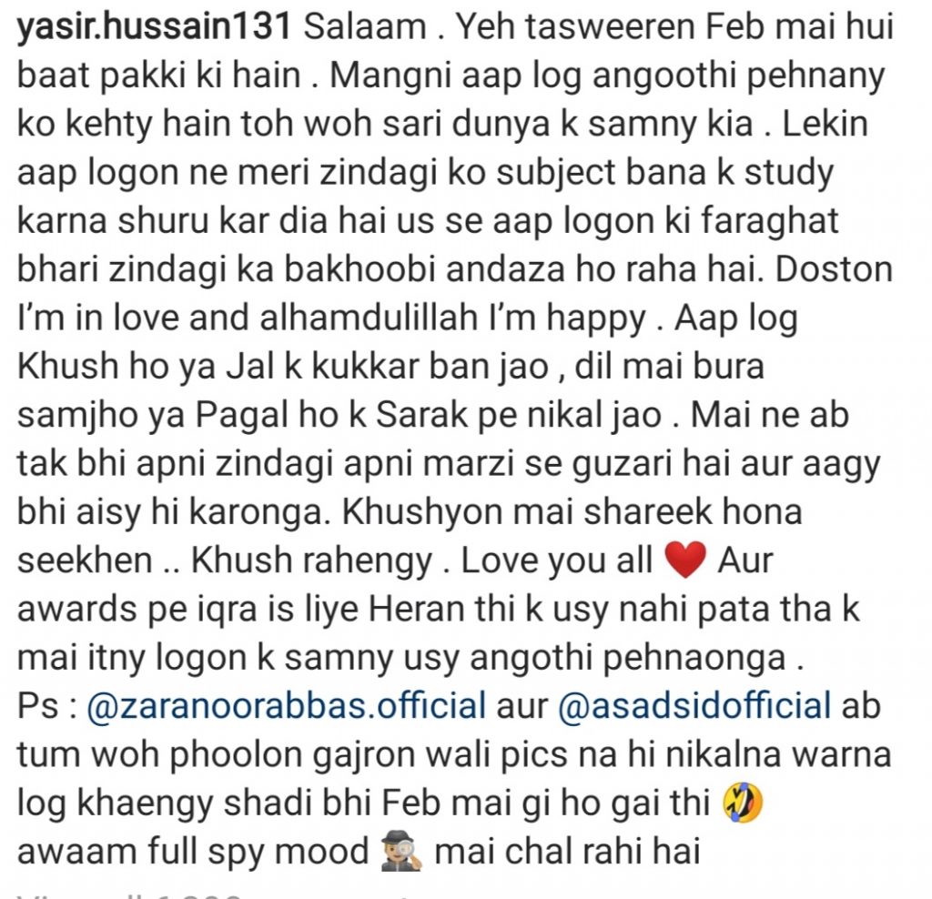 Don't really know why everyone is making so much fuss about #iqraaziz and #YasirHussain engagement. As long as they are happy it doesn't really matter that whether they got engaged recently or like 2 months back
